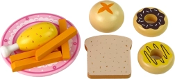 Inclusief bord en een selectie etenswaren: donuts, broodje, frietjes en een kippenpoot – ideaal om te serveren en kokje te spelen.