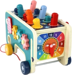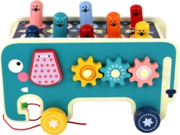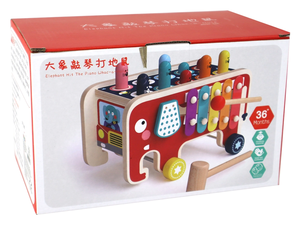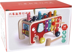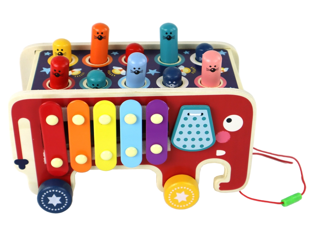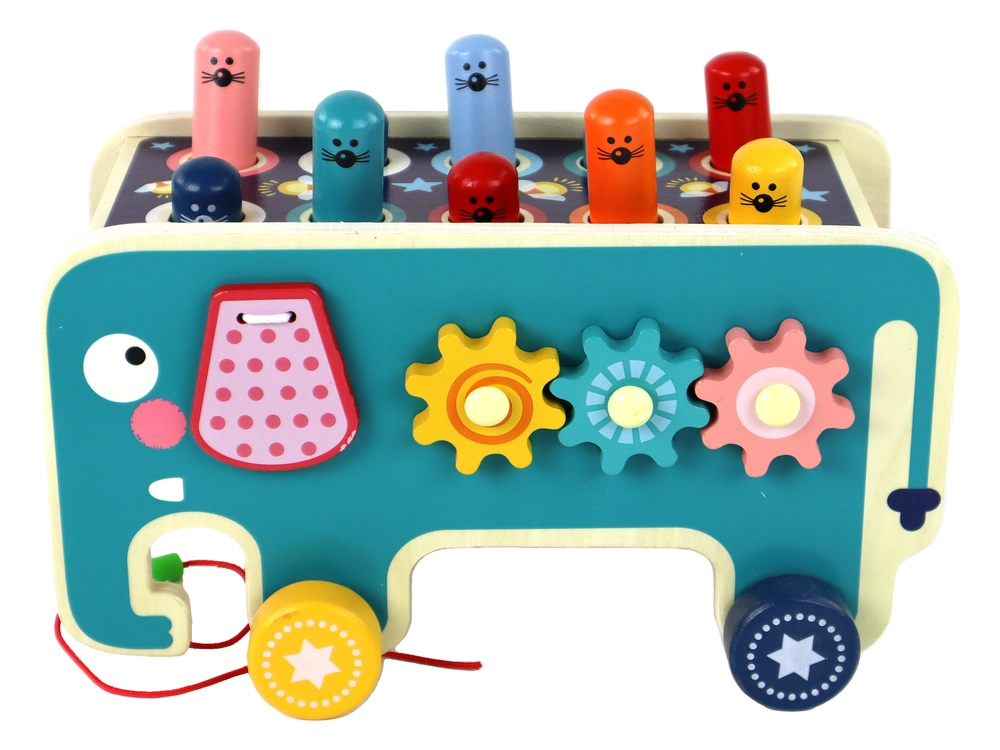De set bestaat uit een houten autootje met een olifantenmotief dat de aandacht van de allerkleinsten trekt. Op het dak van de auto staan kleurrijke kopjes van gravende dieren die het doelwit zijn in het spel "Whac‑a‑Mole". Kinderen proberen ze te raken met de meegeleverde hamertjes, waardoor ze hun handvaardigheid en motorische coördinatie ontwikkelen.