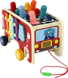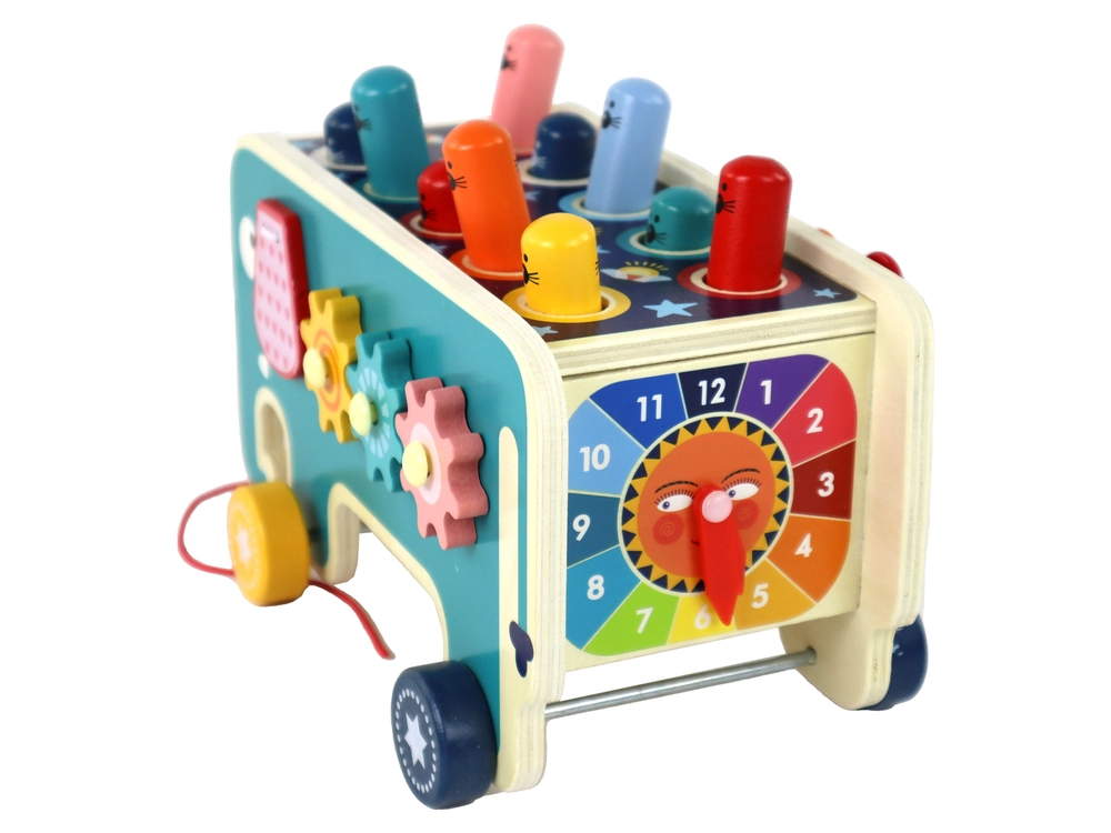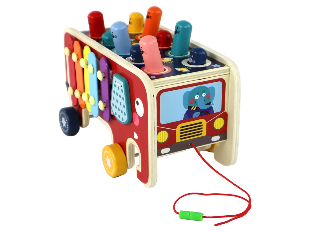 De set is compleet en bevat een autootje met trekkoord, 2 hamertjes voor het spel "Whac‑a‑Mole" en een stok voor de cimbalen. Het speelgoed is bovendien gemaakt van veilig, niet‑toxisch hout, wat duurzaamheid en veiligheid voor kinderen garandeert.