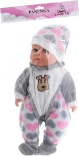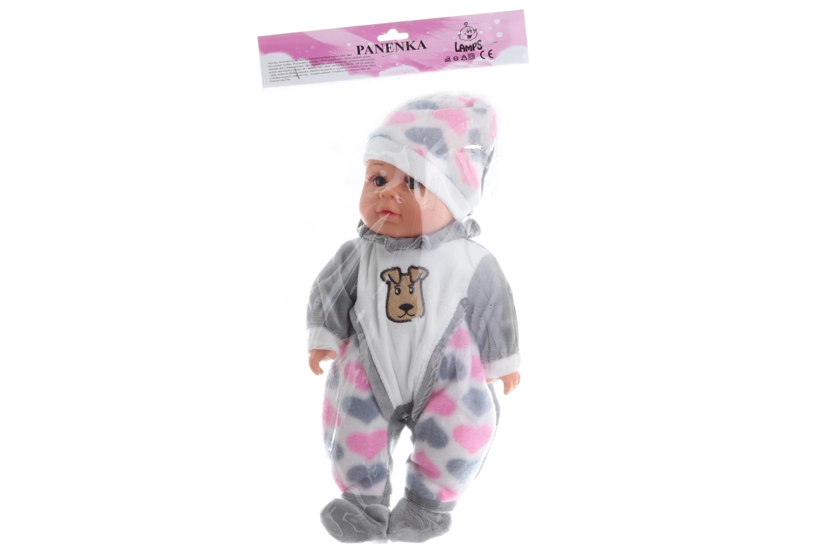Baby met zacht lijfje. Bij het indrukken van het buikje maakt de baby geluiden (lachen, huilen, mama, papa). De baby draagt een kleurrijke pyjama die kan worden uitgetrokken (klittenband). Afmetingen van de baby ca. 30 x 15 x 6 cm. Verpakt in een plastic zak. Werkt op 3 knoopcelbatterijen. Leeftijd 3+