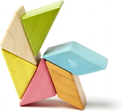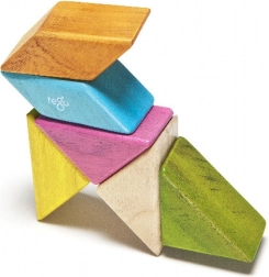 De set bevat gekleurde houten driehoekige blokken die gemakkelijk aan elkaar kunnen worden gekoppeld dankzij de magnetische verbinding. Het kind kan spelen met verschillende vormen en kleuren, wat zijn creatief denken bevordert.