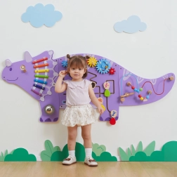 Kleurrijk houten wandpaneel in de vorm van een triceratops van VIGA TOYS met tal van activiteiten voor de ontwikkeling van kinderen. Je vindt erop een xylofoon met stokje en een bel/gong, draaibare tandwielen, een doolhof met 5 te openen eitjes (spiegeltje + kleine dino’s), veranderende ogen via een knop en een boeiende bead maze met kralenlanceerder. Geweldig voor fijne motoriek, oog-handcoördinatie en sensorische exploratie.