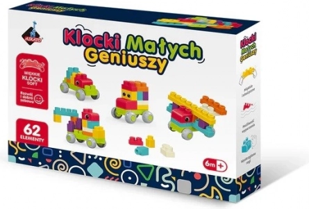 Kleine Genieën Soft Blokken – de ideale keuze voor de eerste bouwwerken. Dankzij het zachte, veerkrachtige materiaal en de afgeronde hoeken zijn de blokken maximaal veilig voor de jongste kinderen. Met 10 wielen kunnen kinderen eenvoudige voertuigen bouwen, hun fantasie ontwikkelen en de basisprincipes van constructie leren.