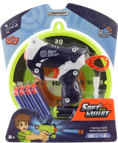 In de verpakking vind je een pistool, een doelwit, 8 schuimkogels en een schroevendraaier – alles wat je nodig hebt voor direct plezier.