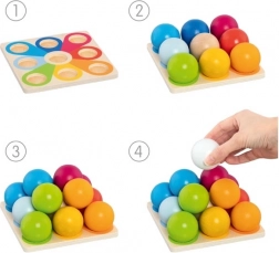 Deze houten piramide met balletjes is een ideaal hulpmiddel voor de ontwikkeling van de vaardigheden van kinderen. Kinderen kunnen de balletjes sorteren op kleur en stapelen in verschillende vormen, waardoor ze hun creativiteit ontwikkelen. Elk balletje heeft een levendige kleur, die kinderen helpt de diversiteit aan kleuren te leren kennen.