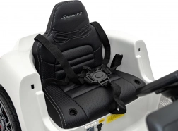 Kunstlederen stoel met gordels, een realistisch stuur en uitgebreide connectiviteit: MP3, USB, AUX, Bluetooth en FM-radio voor maximaal plezier.