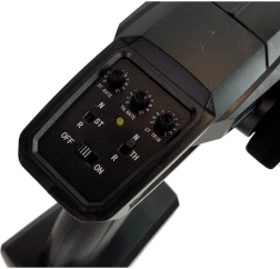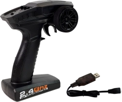 De ergonomische zender maakt fijne gasdosering en nauwkeurige besturing mogelijk. De 2,4 GHz-frequentie elimineert storingen en het bereik tot 80 m geeft vrijheid tijdens het rijden. Voeding 3× AA (niet inbegrepen).