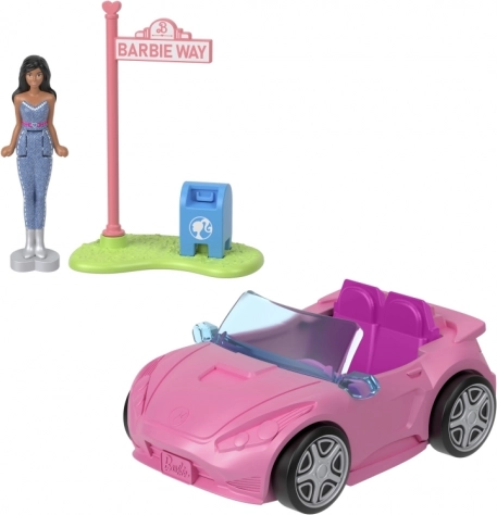 - Inhoud van de verpakking: minipop, roze cabriolet, eilandje met “Barbie Way”-bord en brievenbus