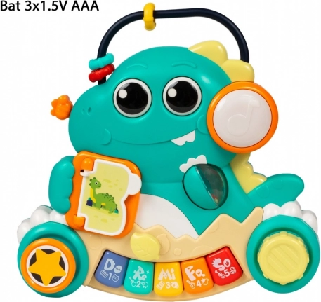 Het kind kan het bijtje verschuiven en zien hoe de dino met zijn ogen beweegt, of aan het wieltje op de poot draaien en naar verschillende melodieën en geluiden luisteren. De modus-schakelaar laat kiezen tussen de muziekmodus en de geluidsmodus – ideaal voor afwisselend en prikkelend spel.