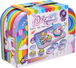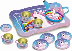 De stijlvolle theeset met eenhoornmotief brengt plezier in elk kinderkookspel. Dankzij de stevige metalen uitvoering is hij bestand tegen enthousiast dagelijks serveren. Het kleurrijke koffertje met handvat maakt het gemakkelijk om alle onderdelen samen te dragen en op te bergen.