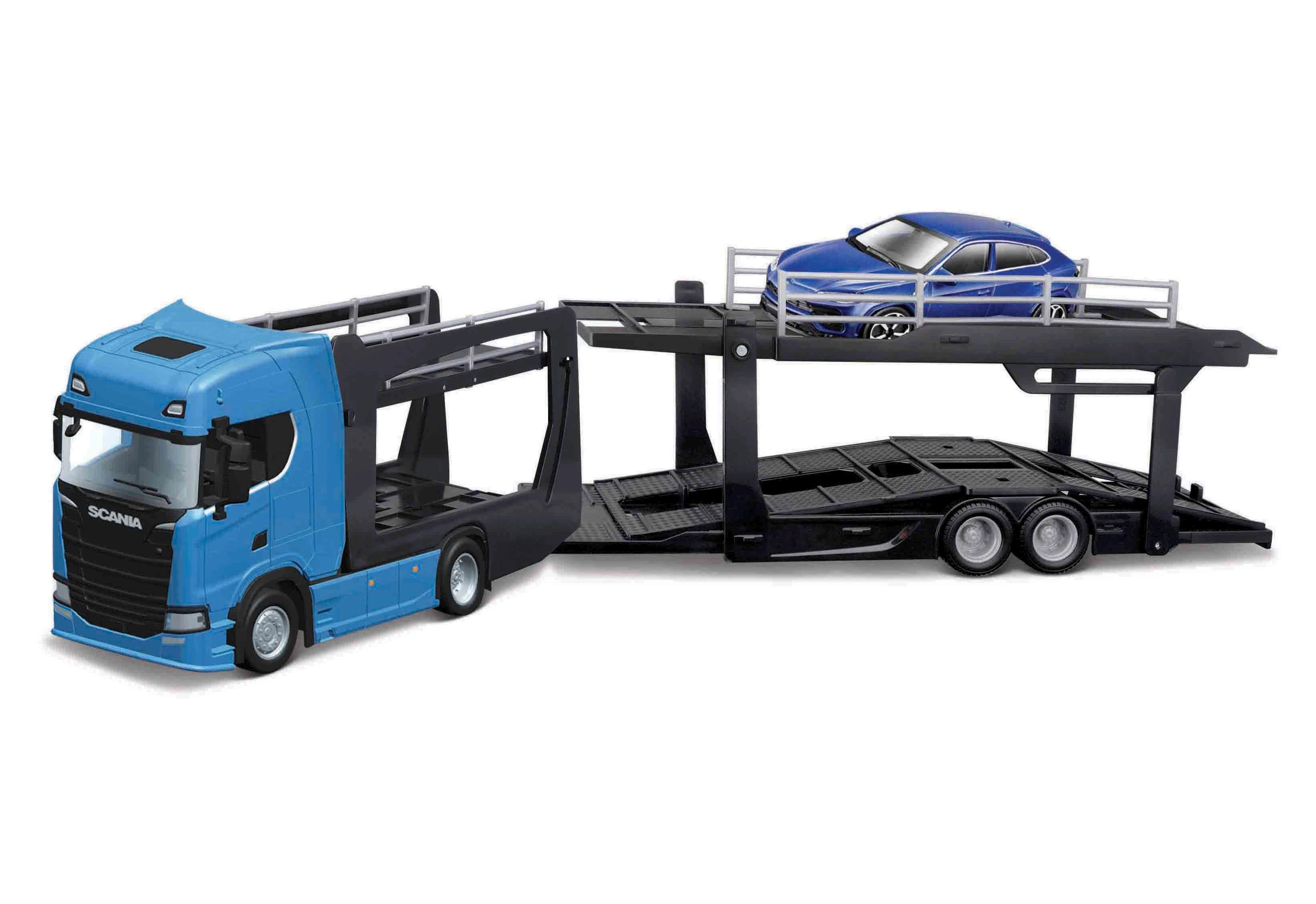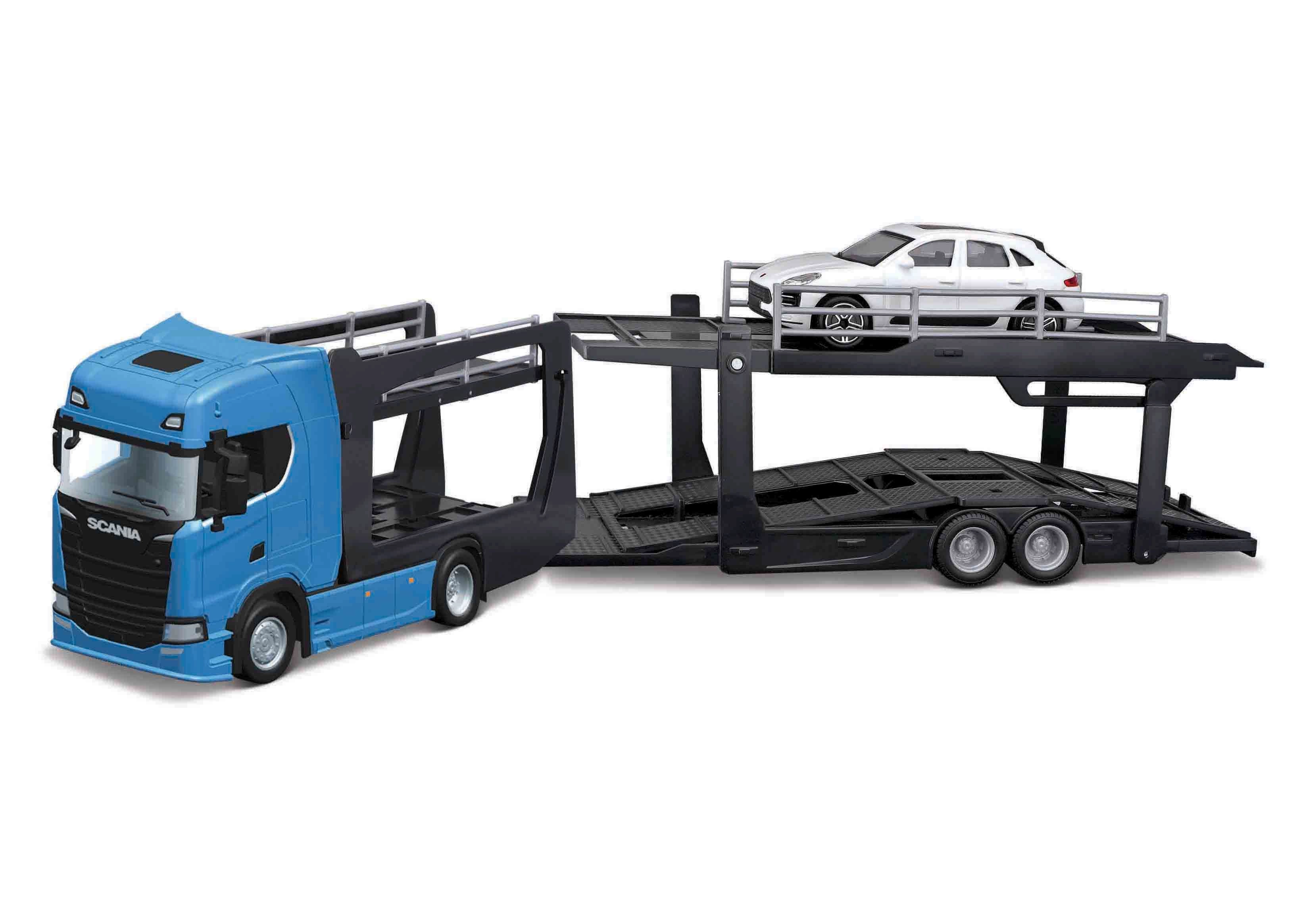 Ontdek de realistische Multicar Carrier vrachtwagen op schaal 1:43, die de robuuste Scania 770S-cabine combineert met een meerlaagse oplegger voor het vervoeren van modelauto’s. De set bevat een sportieve Lamborghini Urus, zodat je direct na het uitpakken “de weg op” kunt en je collectie kunt uitbreiden.