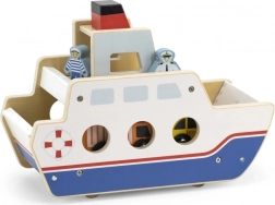 Deze hoogwaardige houten veerboot maakt alle kleine liefhebbers van voertuigen en boten blij. De boot rijdt op wieltjes, waardoor hij gemakkelijk te verplaatsen is, en heeft neerklapbare oprijplaten aan beide kanten, zodat autootjes comfortabel kunnen op- en afrijden. De robuuste afwerking en gladde randen zijn ideaal voor kinderen vanaf 18 maanden.