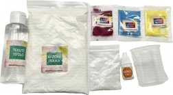 Alles in de doos: De set bevat rijstmeel, vloeibare zeep, een maatbekertje, lepel, slijmpoeder, essence, glitters, kartonnen plaat en een gedetailleerde handleiding.