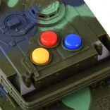 De militaire tank is gemaakt van hoogwaardig plastic, wat zorgt voor een realistische uitstraling en duurzaamheid. De tank is uitgerust met drie gekleurde knoppen die realistische geluiden simuleren, zoals rijden, gereedmaken en het afvuren van een projectiel, of een sirene. Bij elke druk op de knop ervaar je de authentieke sfeer van een gevechtsactie.