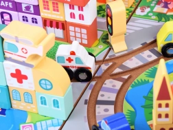 - Stadsblokken: Verschillende houten blokken die kunnen worden gekoppeld en gebouwd in verschillende configuraties.