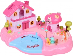 Het huis biedt een meerniveaus interieur met scènes voor alledaags spel: een knusse slaapkamer met bed, een kast die open kan, een badkamer met bad en wastafel, een keukentje met koelkast en een kaptafel. Licht- en geluidseffecten geactiveerd met knoppen versterken de spelsfeer, en de verlichte tekst RABBIT reageert op het ritme van de melodie.