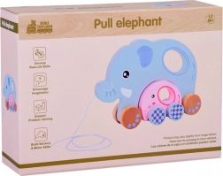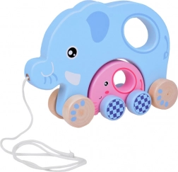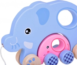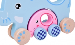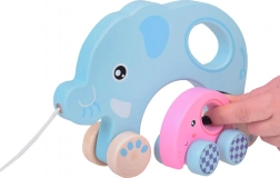 Deze houten trek-olifant in zachte pasteltinten zal elk kind blij maken dat de wereld van het lopen ontdekt. De grotere blauwe olifant draagt in zich een kleiner roze olifantje, dat tijdens het bewegen trouw “meereist” met mama. Het speelgoed is glad afgewerkt en aangenaam om aan te raken, perfect voor kleine ontdekkers.