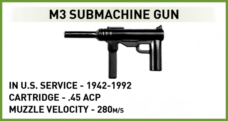 De set bevat functionele elementen: rupsonderstel, draaibare koepel, beweegbare loop, te openen commandantenluik en serviceluik met motormodel. In de doos zitten twee minifiguren – een Amerikaanse tankist met tankkoptelefoon en M3 “Grease Gun”, en een infanterist met M1 Garand – plus omgevingselementen waaronder een stuk hek en een haag.