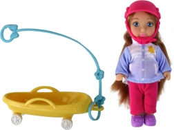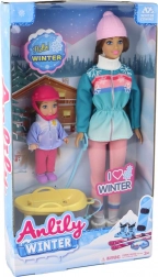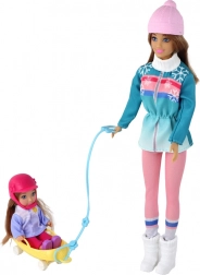 Ontdek de magie van de winter met mama en dochter op de slee. De grote pop heeft lang bruin haar en een warme muts, de kleine pop draagt een roze helm voor extra veiligheid. Pastelkleurige winteroutfits met sneeuwvlokken versterken de sfeer van besneeuwde avonturen en de gele slee nodigt uit tot eindeloos glijden.