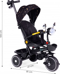 Doordachte details zoals inklapbare en uitschuifbare voetsteunen, lekvrije EVA-wielen (10"/8"), veiligheidsgordel en armleuningen maken het rijden veilig, zowel binnen als buiten. Twee mandjes bieden ruimte voor speelgoed en spulletjes, de voorlamp met gekleurde LED’s en melodieën zal kleine rijders verblijden (3× AA, niet inbegrepen).