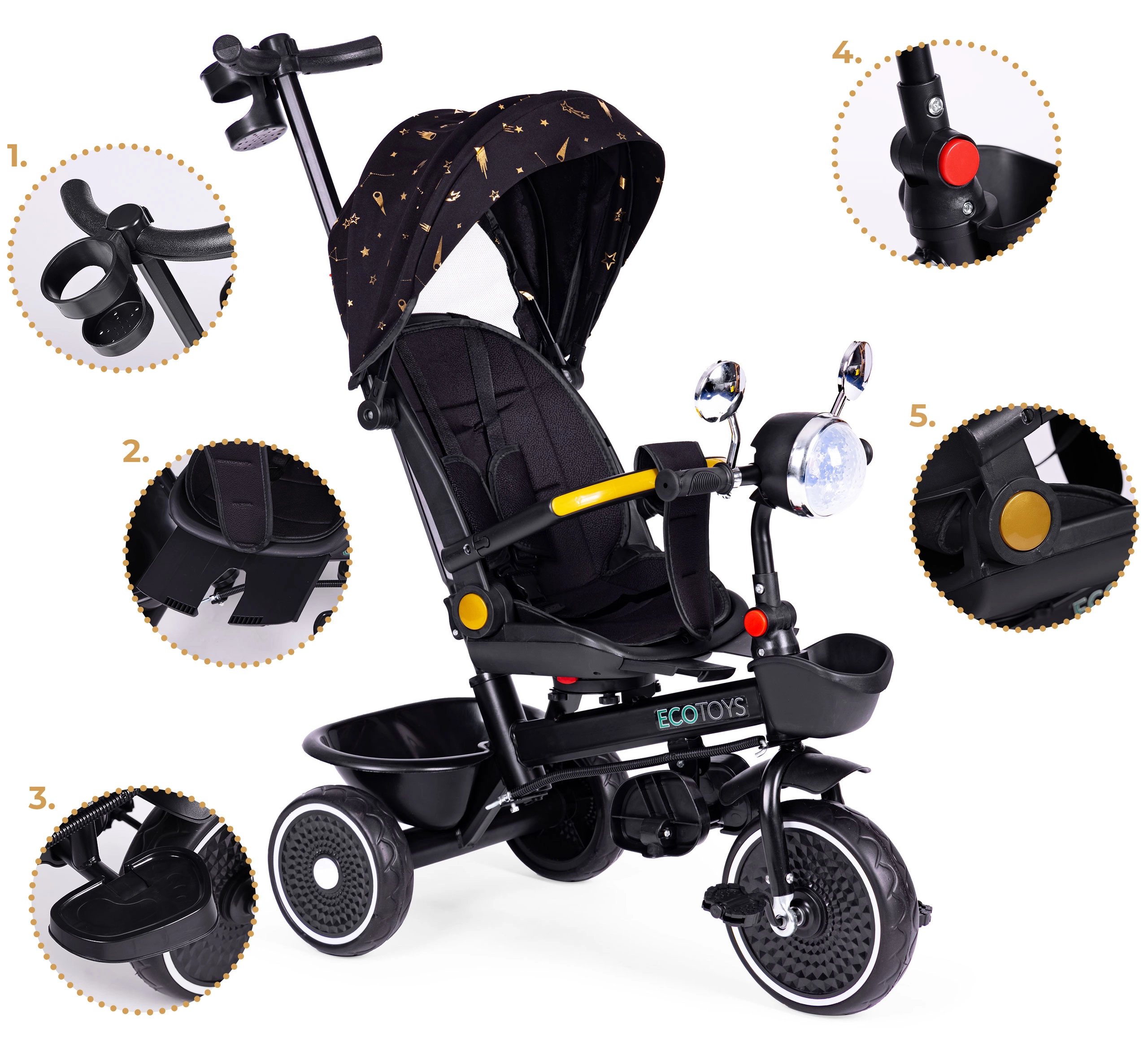 De multifunctionele kinderdriewieler van ECOTOYS groeit met je kind mee van 6 maanden tot 6 jaar. Biedt een 360° draaibare zitting, een duwstang voor ouders, een inklapbare kap en veiligheidsgordels en armleuningen. Dankzij de duurzame stalen constructie, EVA-wielen en praktische accessoires (lamp met melodieën, houder voor drankjes, opbergmandjes) zorgt hij voor comfort, veiligheid en plezier bij elke wandeling.