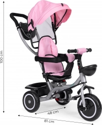 Afhankelijk van de leeftijd kun je onderdelen (kap, beugel, duwstang) eenvoudig verwijderen en de driewieler aanpassen aan de vaardigheden van het kind. Praktische mandjes en een vak met rits bieden ruimte voor speelgoed, een fles en kleine reisbenodigdheden.
