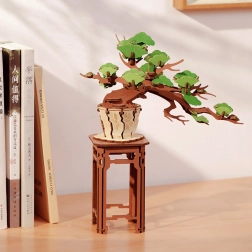 Deze gedetailleerde bonsai op een elegante standaard met een textuur van gebarsten aarde valt op door de verstrengelde takken en gestructureerde bladeren, die de kracht en volharding van groenblijvende bomen oproepen. Het bouwen stimuleert fijne motoriek, ruimtelijk inzicht en geduld, dus perfect voor ontspanning én vaardigheidsontwikkeling.
