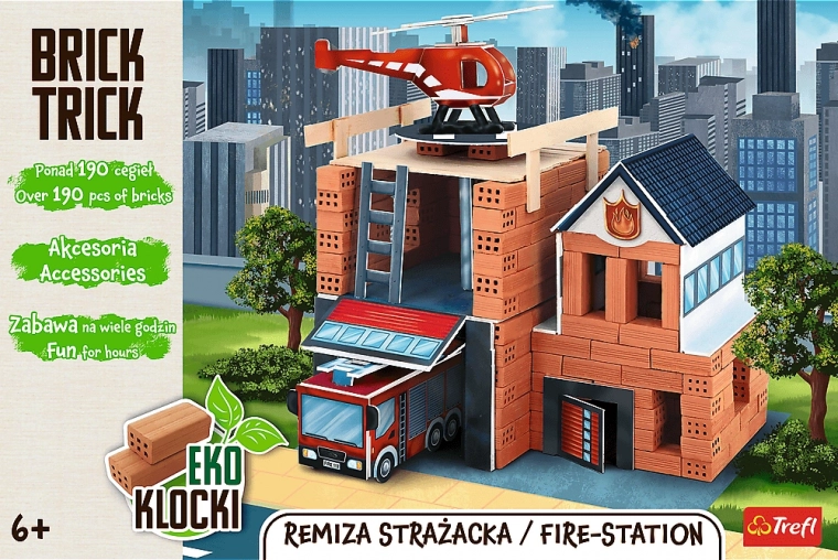 Bouw je eigen brandweerkazerne van echte kleistenen en houten plankjes. De set BRICK TRICK biedt meer dan 190 steentjes, herhaald gebruik dankzij in water oplosbare lijm en volop decoratieve accessoires voor een realistische uitstraling. Ideaal voor het ontwikkelen van fijne motoriek, creativiteit en concentratie bij kinderen vanaf 6 jaar.