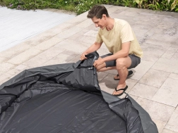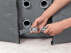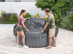 De montage is snel en intuïtief. Een verstelbare omtrekband met veiligheidsclips zorgt voor een stevige bevestiging, terwijl een geïntegreerde rits een probleemloze aansluiting op de pomp mogelijk maakt zonder de hoes te hoeven verwijderen. De hoes is compatibel met de modellen Lay‑Z‑Spa St. Moritz, Monaco, Santorini HydroJet Pro en andere ronde jacuzzi’s met een diameter van 216 cm.