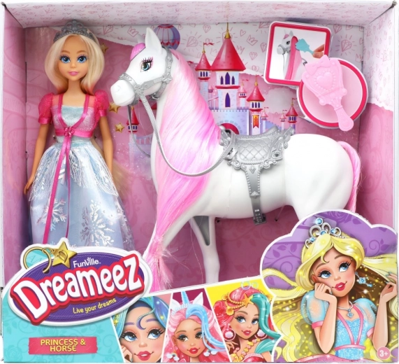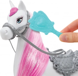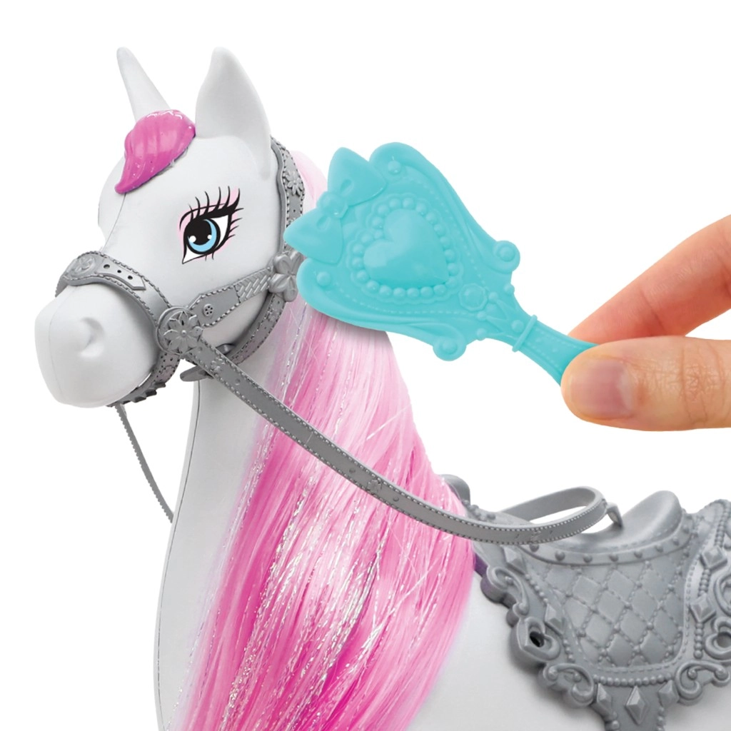 De pop is ongeveer 29 cm hoog, draagt een kroon en een rijk gedecoreerde jurk; het paardje is uitgerust met een zadel en hoofdstel. Dankzij de accessoires wordt het spel nog realistischer en leuker – van ritjes tot het verzorgen van de manen.