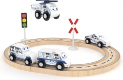 De set bevat in totaal 16 delen, inclusief rails en politievoertuigen, die eenvoudig kunnen worden opgebouwd en uitgebreid met andere houten sets.
