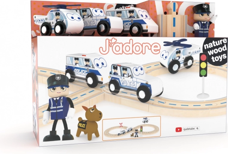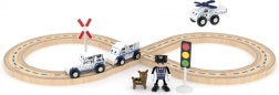 In de verpakking zitten rails en 4 politievoertuigen die vrij te combineren zijn en passen in thematische verhaaltjes. De set is compatibel met gangbare houten treinbanen, zodat je kunt uitbreiden met extra elementen en grotere trajecten kunt maken.
