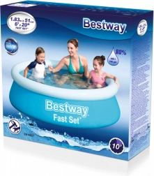 Het opblaasbare Bestway Fast Set-zwembad met een diameter van 183 cm en een hoogte van 51 cm is een praktische en voordelige oplossing voor thuisgebruik. Het is gemaakt van duurzaam DuraPlus-materiaal, dat duurzaamheid, weerstand tegen UV-straling en mechanische beschadiging garandeert. Je plaatst het eenvoudig op gras of op een harde, vlakke ondergrond.