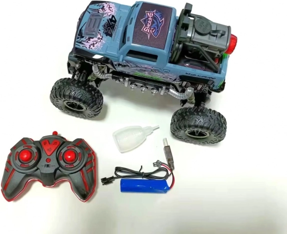RC auto Rock Shark in blauw met lampen, geluiden en nebeleffect. Snelheid 8–12 km/u, 2,4 GHz, bereik 40–50 m. Plezier voor kinderen en beginners.