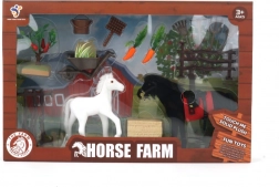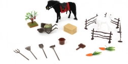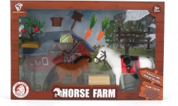 De set bevat alles wat je nodig hebt om je eigen paardenboerderij te creëren, inclusief paardenfiguren, boerderijinstrumenten en groenten.