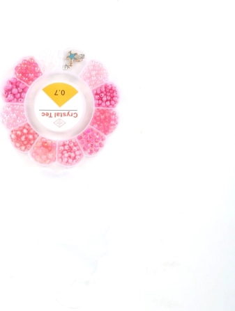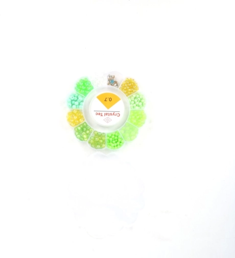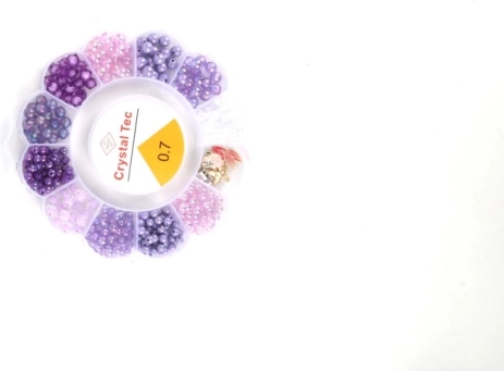 De ronde voorraadhouder met vakjes houdt de kralen gesorteerd op kleur en grootte, zodat je alles snel bij de hand hebt en het knutselen vlot gaat.