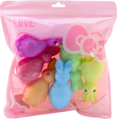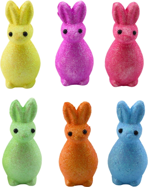 Verfraai je paasdecoratie met een set van zes kleurrijke haasjes van piepschuim met een glinsterend effect. In levendige kleuren en met een lichte maar stevige constructie zijn ze ideaal voor op de tafel, in een mandje of in de kinderkamer. Elk haasje meet 10 × 4,5 cm en geeft je huis een feestelijke sfeer.