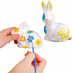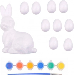 Paasset met polystyreen eieren en konijnenfiguur met verf