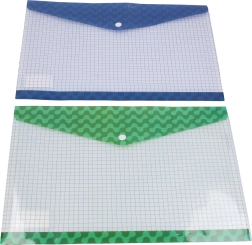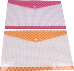 Praktische en stijlvolle map met drukknoop van 36x26 cm, ideaal voor het organiseren van uw documenten. Verkrijgbaar in vier aantrekkelijke kleuren: blauw, roze, oranje en groen.