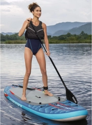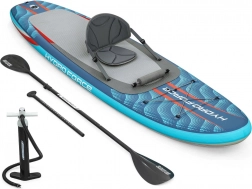 In enkele stappen maak je er een comfortabele sit-on-top kajak van – je klikt eenvoudig het zitje met rugleuning en de voetsteun vast. Geïntegreerde handgrepen, elastische koorden voor en achter en achterste D-ringen maken het vastzetten van persoonlijke spullen of een koeltas eenvoudig. Drie afneembare vinnen verbeteren de koersstabiliteit, de snel los te koppelen veiligheidsleash kan om de enkel of in de taille gedragen worden. De dubbelwerkende handpomp zorgt voor snel oppompen; na het varen laat je de lucht er gemakkelijk uit en berg je alles op in de deluxe rugzak.