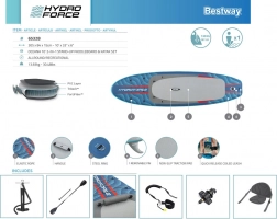 - Board, zitje met rugleuning, voetsteun, dubbelwerkende handpomp, peddel, leash, rugzak, reparatieset