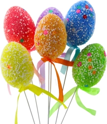 Dankzij de lichte constructie en de elastische draad zijn de eitjes eenvoudig te plaatsen in arrangementen, kransen of bloemstukken. Ze zijn ook geschikt voor creatieve paasprojecten.