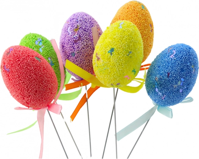 Breng je lentedecor tot leven met een elegante set van zes paaseitjes op steker. Elk eitje is versierd met kleine bolletjes en subtiele “nootjes” en afgewerkt met een bijpassend strikje. Dankzij de lichte styropor-decoratie, pasteltinten en de flexibele draad is schikken eenvoudig en effectief – ideaal voor boeketten, bloembakken, kransen en de feesttafel.