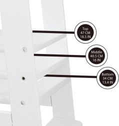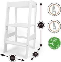 De witte leertoren is een praktische en veilige hulp voor uw kind in de keuken of badkamer. Dankzij de drie verstelbare hoogtes past hij zich aan de behoeften aan en de lengte van uw kind, wat maximaal comfort en efficiëntie garandeert.