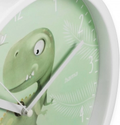 Deze kinderwandklok brengt vrolijkheid en kleur in elke kamer. Dankzij de groene wijzerplaat met dinosaurusmotief trekt hij de aandacht van kinderen en stimuleert hij hun interesse om de klok te leren lezen.