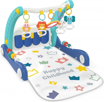 Op de mat met stang kunnen 4 speeltjes worden opgehangen, die de zintuigen van het kind prikkelen en zijn aandacht stimuleren. Het product werkt op 3xAA batterijen (niet inbegrepen), wat zorgt voor langdurig speelplezier.