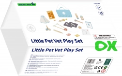 De set bevat 16 verschillende onderdelen, waaronder een stethoscoop, een injectiespuit en andere medische instrumenten, waarmee kinderen het echte werk van een dierenarts kunnen nabootsen.