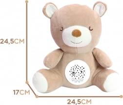 De beer is gemaakt van zacht, pluche materiaal en gevuld met watten voor maximale knuffeligheid. Dankzij het uitneembare mechanisme kun je de knuffel eenvoudig wassen en kan je kind hem ook als klassieke knuffel gebruiken. 3 volumeniveaus laten je het geluid precies afstemmen op de behoeften van je baby.