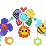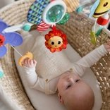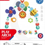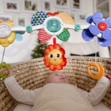 WOOPIE boog met speelgoed is ontworpen om kinderen niet alleen te vermaken, maar ook te ontwikkelen. Op de boog vind je verschillende speeltjes, zoals een windmolentje met een lieveheersbeestje dat draait en vibreert bij beweging, een piepend zonnetje bij indrukken, een rammelende vlinder met een doorzichtige bal waarin kleurrijke kralen springen, evenals ruisende materialen die bijdragen aan de zintuiglijke ervaring van het kind.