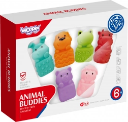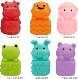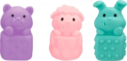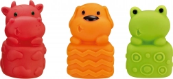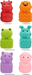 Sensorische rubberen diertjes van het merk Woopie voor extra plezier tijdens het baden. Deze diertjes zoals nijlpaard, schaap, konijn, kat, kikker en hond zijn gemaakt van zacht rubber en kunnen dankzij een opening water spuiten. Elk diertje hangt aan een ondergrond met suction cups voor gemakkelijke bevestiging.